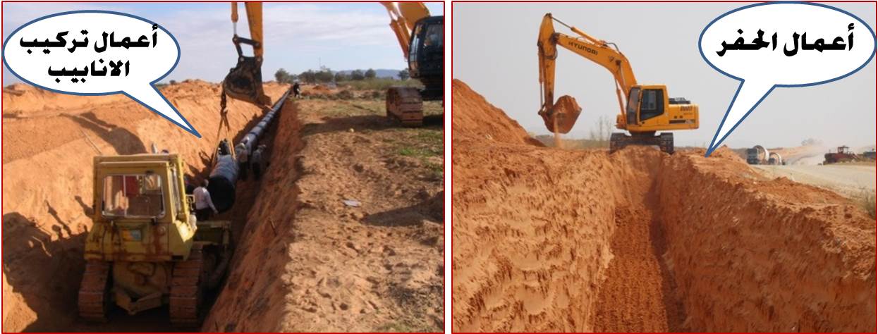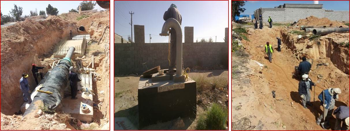 جاري العمل في تنفيذ الشبكة فقد تم خلال الفترة تنفيذ صب كتل خرسانية و تركيب غرف صمامات و سلالم و أنابيب تهوية و تركيب و ردم أنابيب خطوط DI وبإجمالي طول 69 متر طولي.