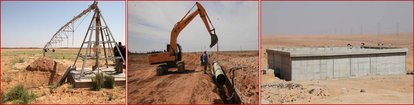 وقد أوصي المخطط الزراعي العام بالاستفادة من مياه المشروع المحلية الجوفية وحيث أن هذه المياه الناتجة عن حفر آبار إرتوازية ساخنة تصل درجة حرارتها إلى 60 مْ وحتى نتمكن من استغلال هذه المياه في الأغراض الزراعية وتخفيض درجة حرارتها إلى الحد المسموح به لري المحاصيل الزراعية ، ثم إستعمال الآت الري المحوري بنوع خاص من الرشاشات(I-web) والتي تعمل على تخفيض درجة الحرارة إلى الحد الملائم للزراعة تحت نظام الري بالرش .