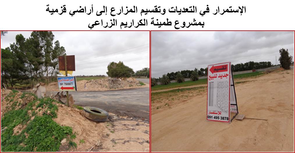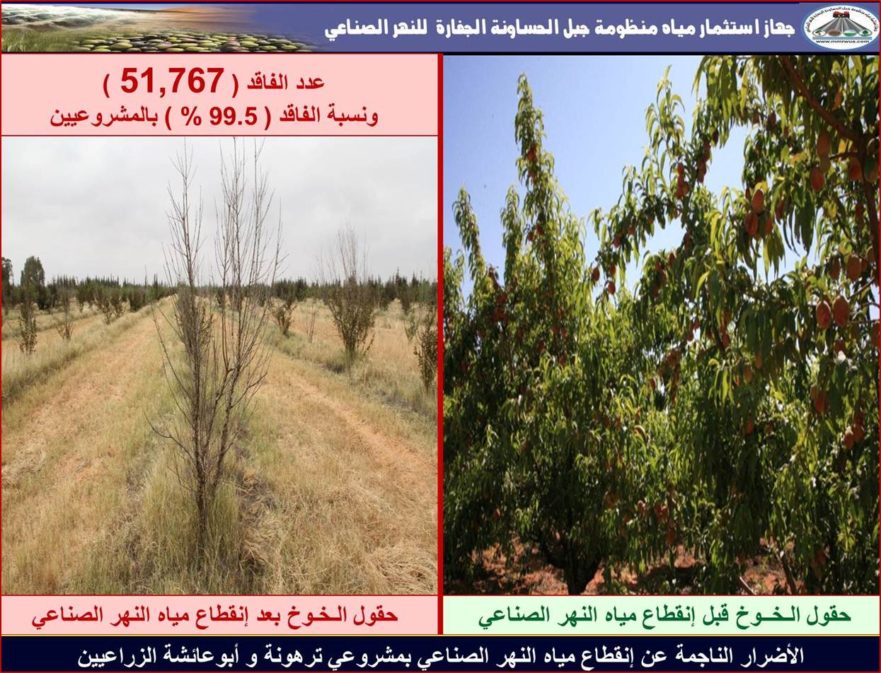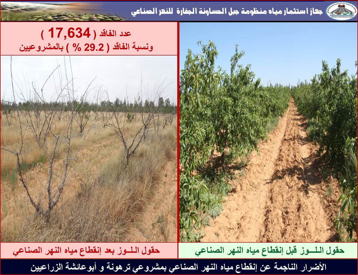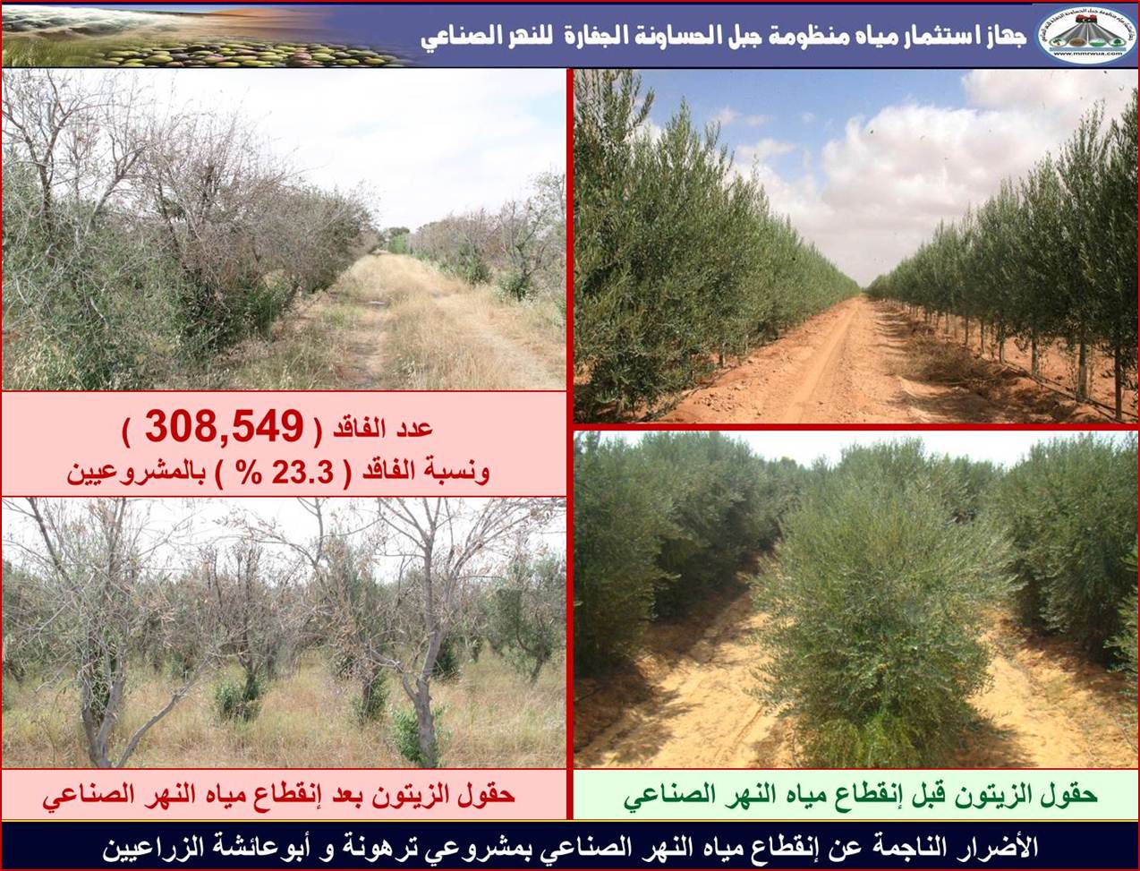 · جفاف مساحات شاسعة وموت أعداد كبيرة من أشجار الفاكهة وأشجار الزيتون الكثيف بمشروعي أبوعائشة وترهونة الزراعيين ،والتي تقدر المساحة المغروسة بمشروع ابوعائشة بحوالي (1195 هكتار ) من اشجار الزيتون و اللوزيات و الكروم وبإجمالي عدد الاشجار (1,469,286 ) شجرة.