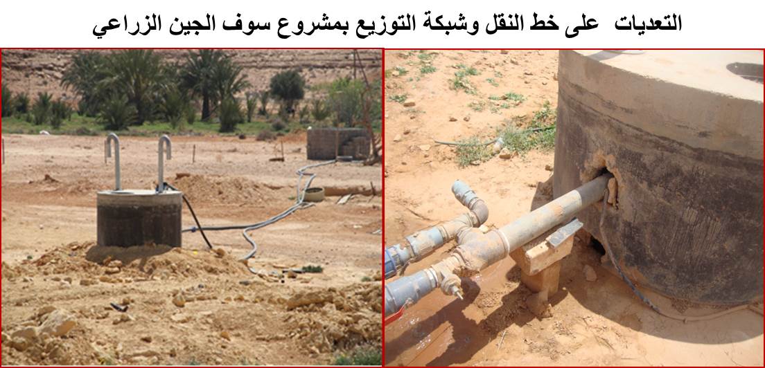 · تعرض المشاريع التي تحت التنفيذ والتي وصلت نسبة الانجاز فيها إلى 80 % إلى التخريب و سرقة محتوياتها واستغلال بعض منها من قبل بعض ضعاف النفوس مما سبب هدر لكميات المياه على فتحات التغذية لهذه المشاريع وإستعمالها بطريقة عشوائية وفوضوية وأثر على الامداد المائي لباقي المشاريع والمدن.
